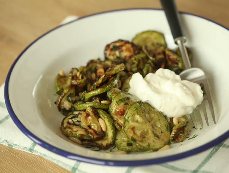 Rețeta zilei este Dovlecei la cuptor cu verdețuri și pinoli