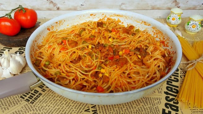 Se aşază spaghetele din morcovi și dovlecei pe o farfurie şi se adaugă sosul peste ele.